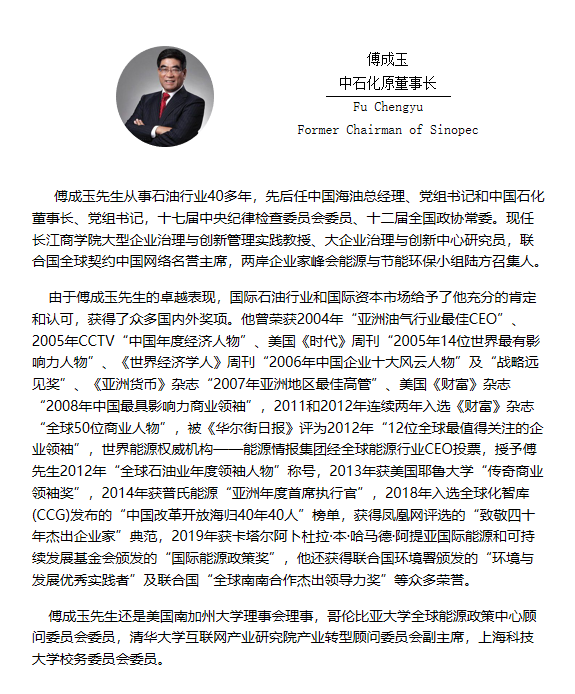 中国能源周组委会主席由中国产业海外发展协会新能源与碳中和分会名誉会长,中石化原董事长、党组书记,中海油原总经理、党组书记傅成玉担任。联席主席有凌文院士、邹才能院士、金之钧院士、欧阳明高院士、徐春明院士、张来斌院士、李雅兰主席、张希良教授、大卫.桑德罗等。
